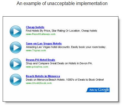 Publishers may not ask others to click their ads or use deceptive implementation methods to obtain clicks. This includes, but is not limited to, offering compensation to users for viewing ads or performing searches, promising to raise money for third parties for such behaviour or placing images next to individual ads.”