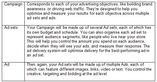 At the beginning of 2014 Facebook introduced the above structure. Previously all ads were created and organised under the Campaign tab. In adding the Ad sets tab, users have greater flexibility. When users edit their Campaigns, targeting is performed in the Ad set section, rather than in the Ad section (as was done in the past). Having it done this way means it’s easier for you to keep track of certain Campaigns you are running. You’ll also be able to split test different audiences with more ease.